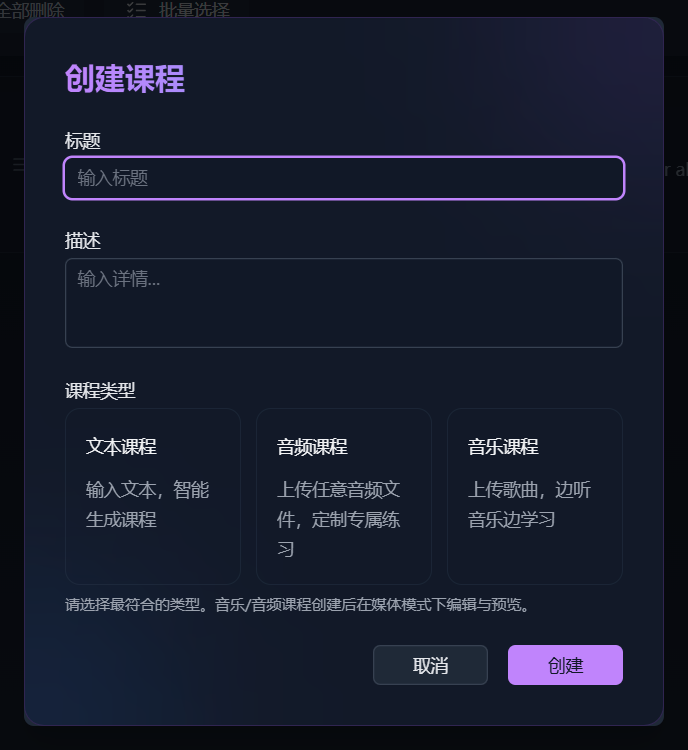 创建完课程,这里以文本课程为例,进入课程后点添加句子,即可添加文本、制作课程。