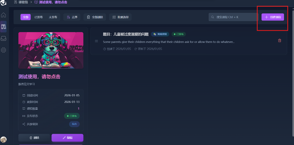 稍等片刻,你就可以在你的“我的课程包”页面找到你制作的课程包。