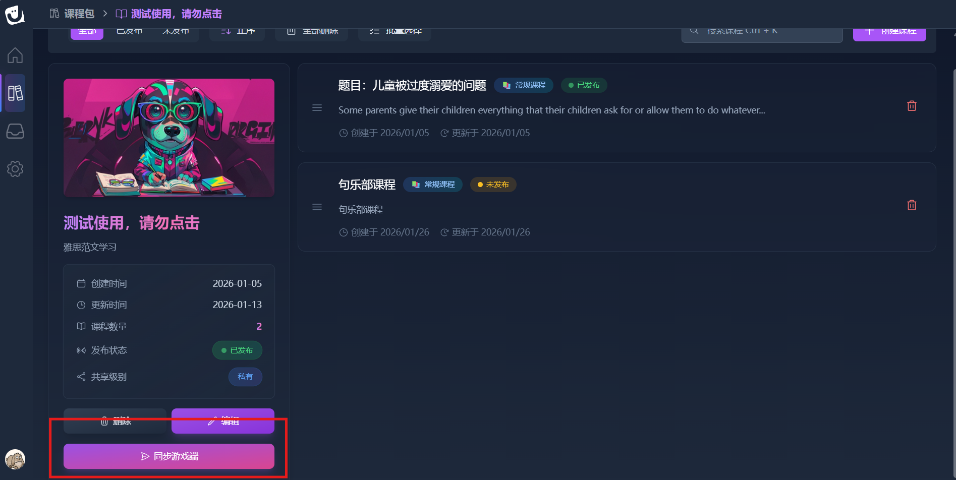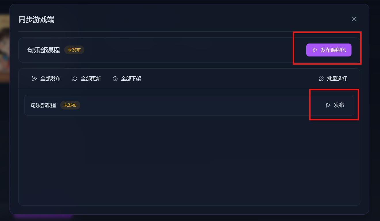 课程编辑完成后,返回课程包页面,点击左下角同步游戏端。