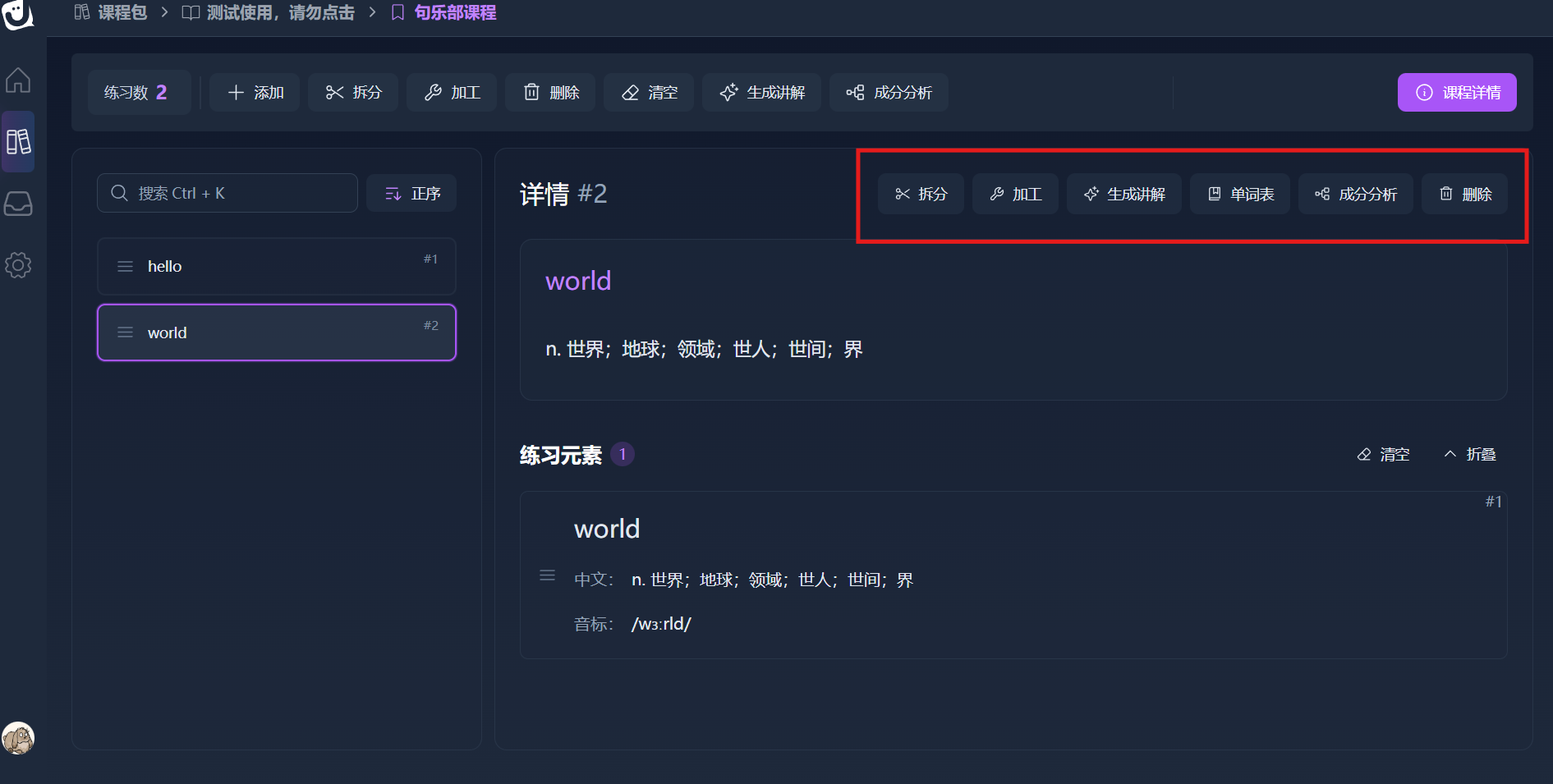 上方栏的按键是针对该课程内所有的内容,例如,点击拆分会将课程内的所有内容进行拆分。
