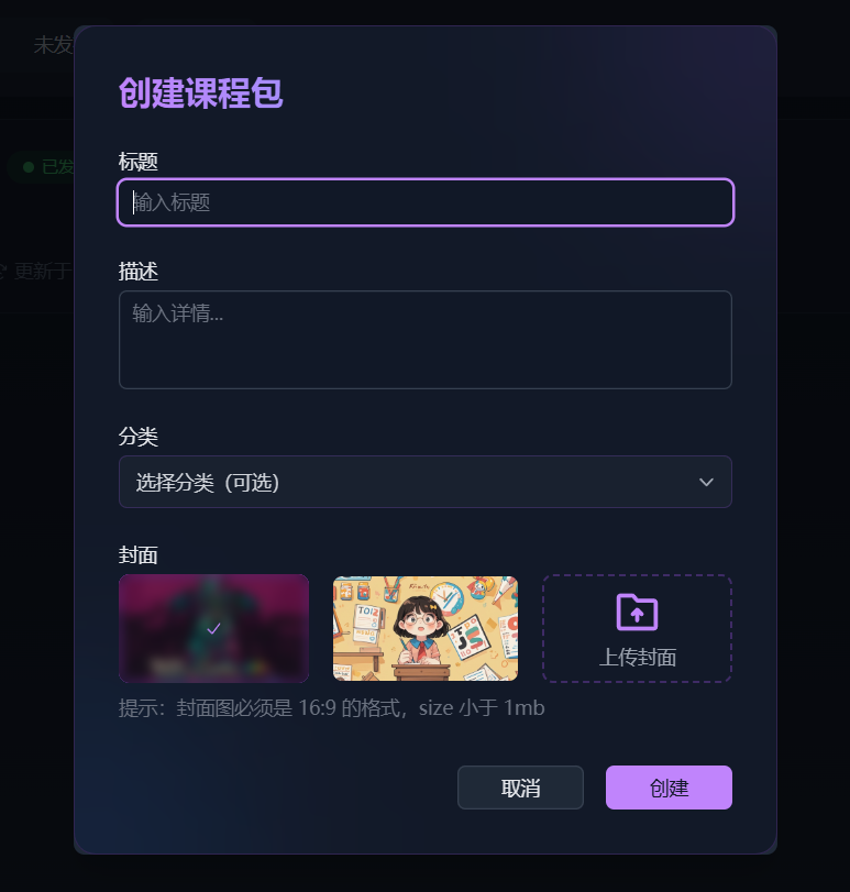 点进已经创建好的课程包,点击右上角创建课程,填写信息
