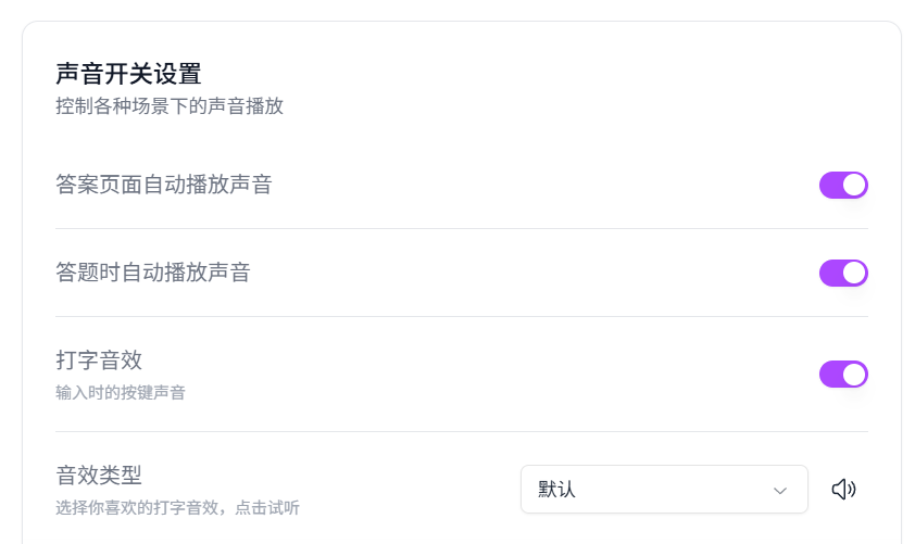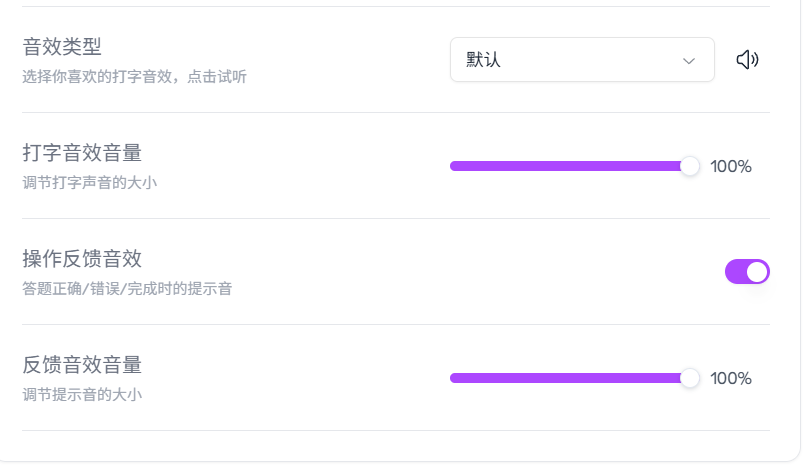 可以分别调整打字音效和答题提示音的音量大小。整体音量由你的电脑/手机系统控制。