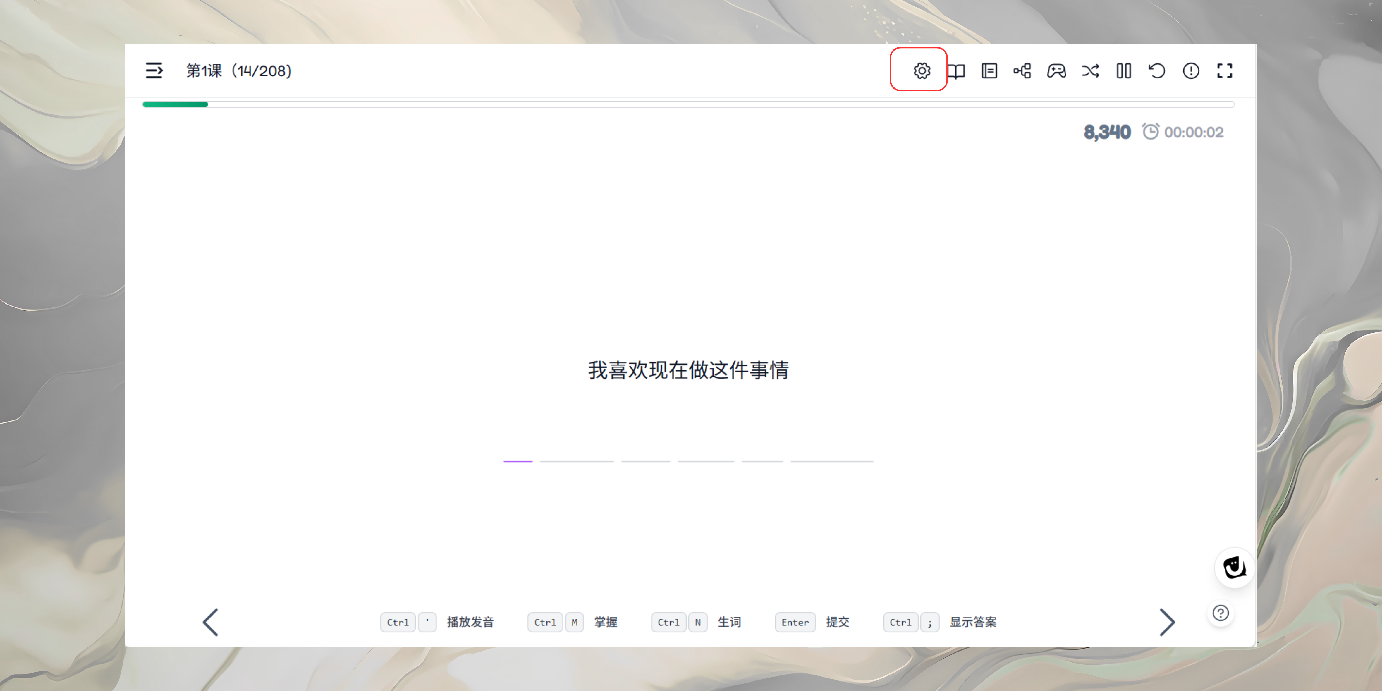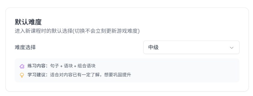 每次进入新课程时,系统会按你选择的默认难度加载练习内容: