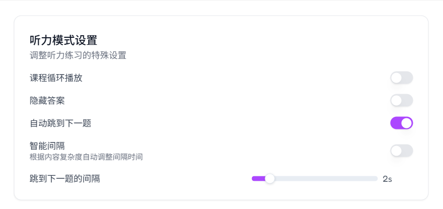 听力模式采用"盲听——慢听——字幕"三阶段训练,你可以对每个阶段进行精细调节: