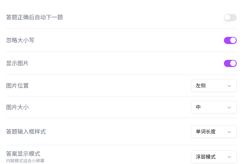 - 显示答案时自动朗读:看到答案的同时听到发音