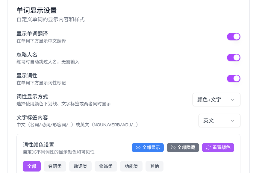 - 自定义词性颜色:可以分别设置每种词性的颜色,也可以隐藏不需要的词性类别